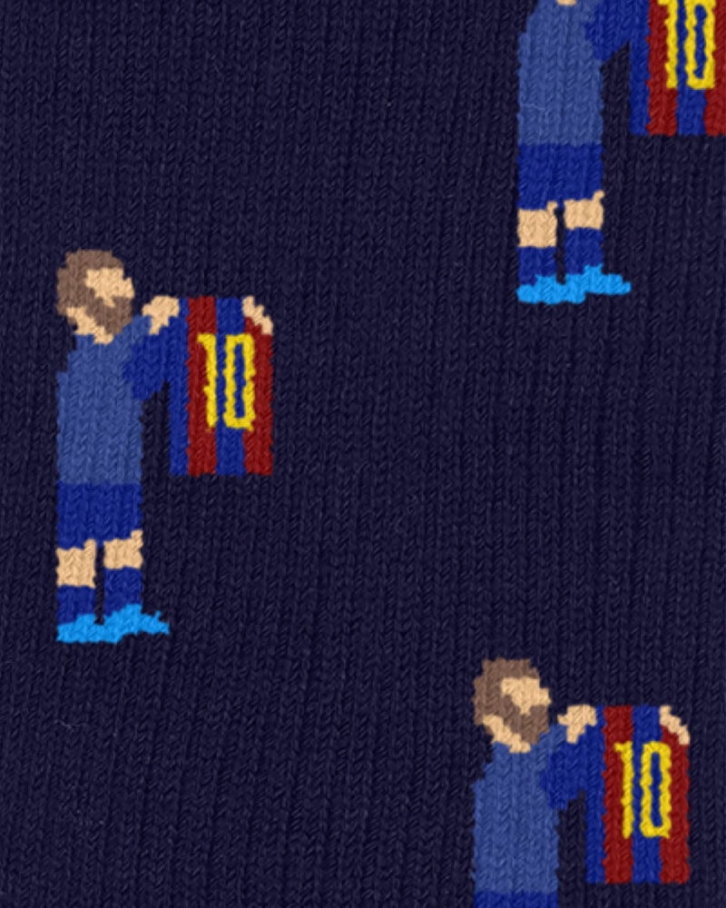 En estos calcetines originales, inmortalizamos la guinda de otra actuación sobrenatural, su celebración en casa del eterno rival. Toda la ciudad de Barcelona recuerda ese partido.