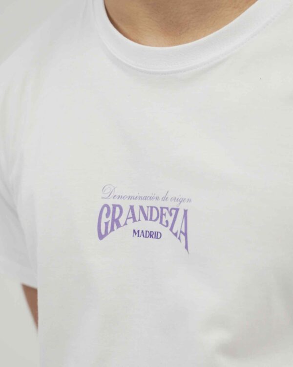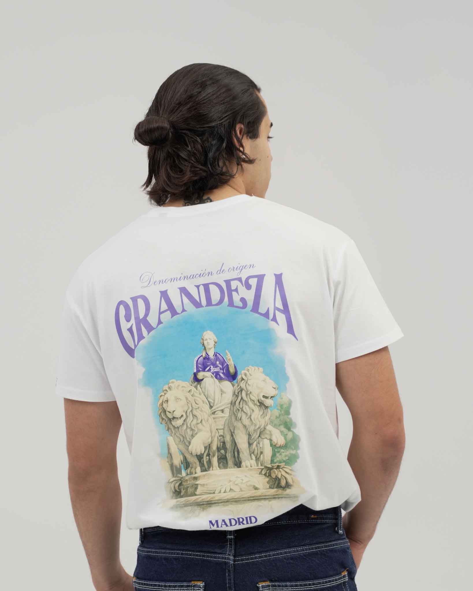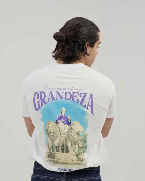 Camiseta de algodón blanca con un símbolo para la historia de los de Chamartín. Cibeles vistiendo la camiseta GRANDEZA.