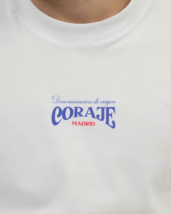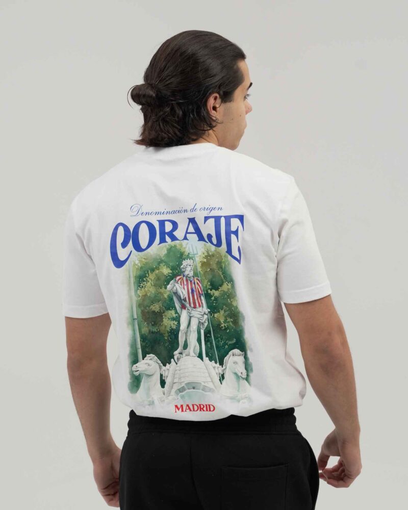 Camiseta de algodón blanca con un símbolo para la historia rojiblanca. Neptuno vistiendo la camiseta CORAJE.