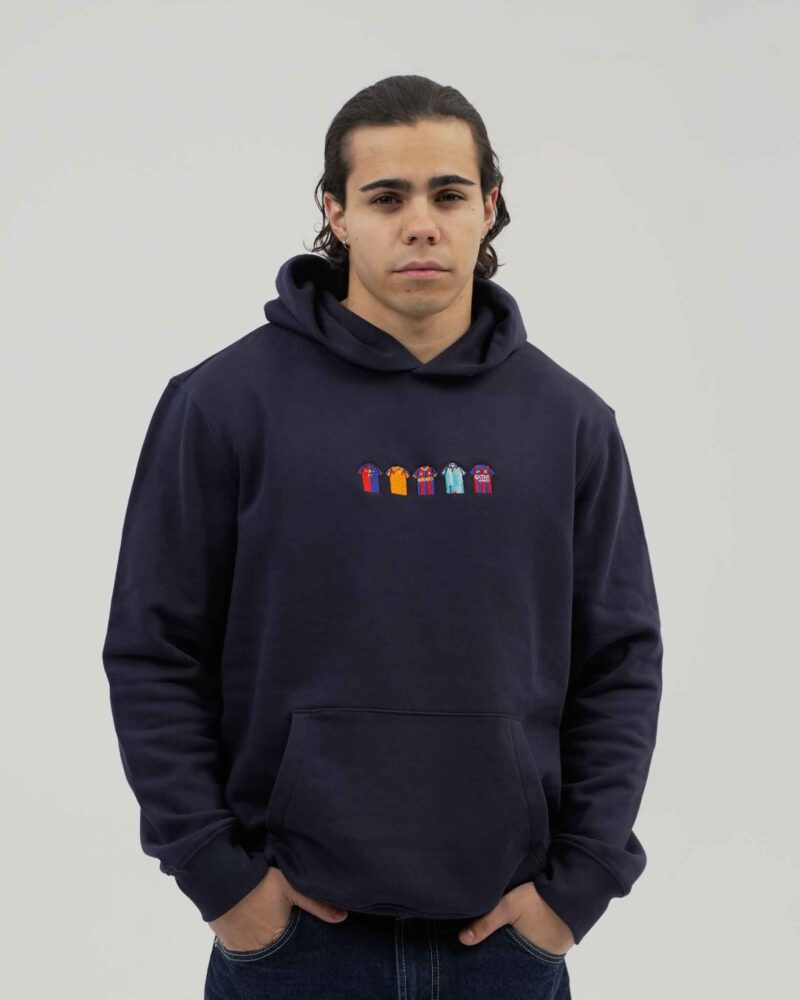 Bordados que son historia del fútbol. Sudadera con capucha de primera calidad con bordado de 5 camisetas míticas para el aficionado catalán.