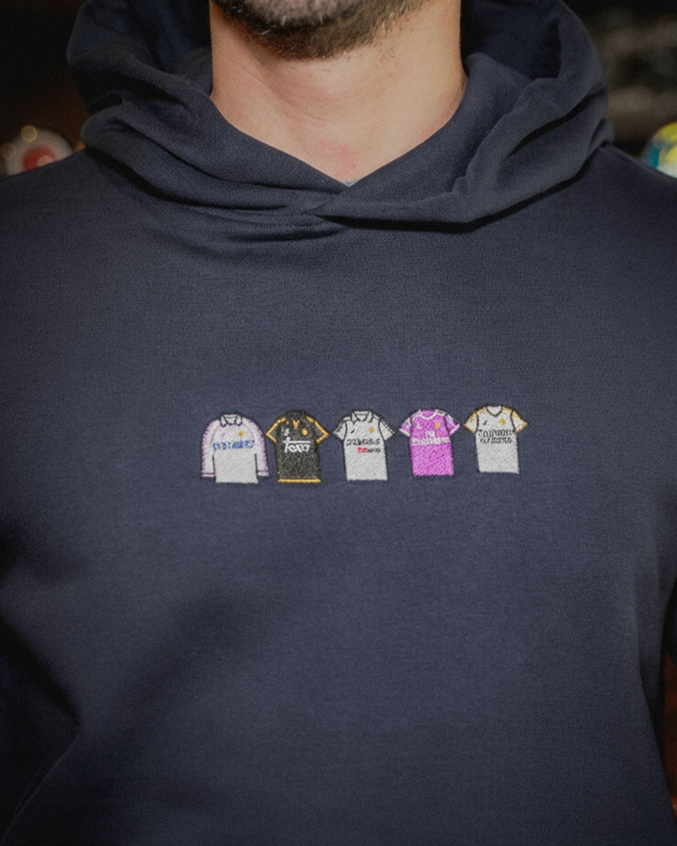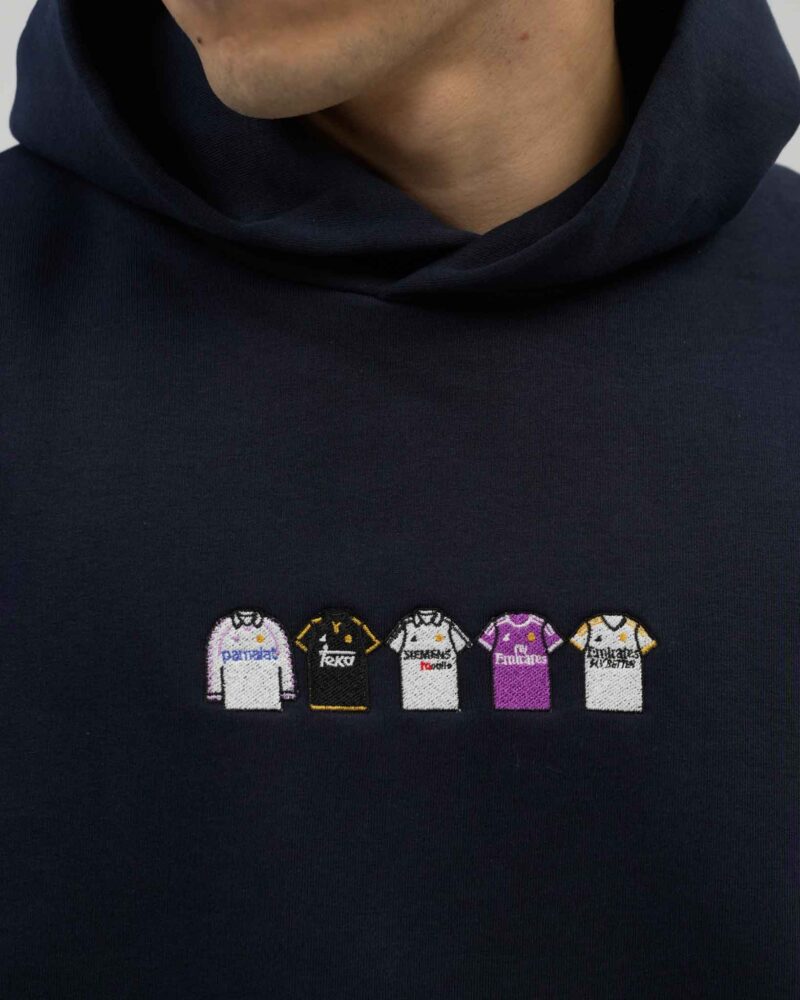 Una hoodie que rememora las míticas equipaciones del equipo blanco con unos bordados de alta calidad.