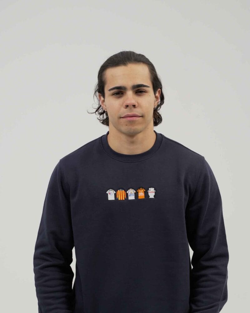 Sudadera sin capucha de color azul navy con 5 equipaciones clásicas del club blanquinegre bordadas en el pecho.