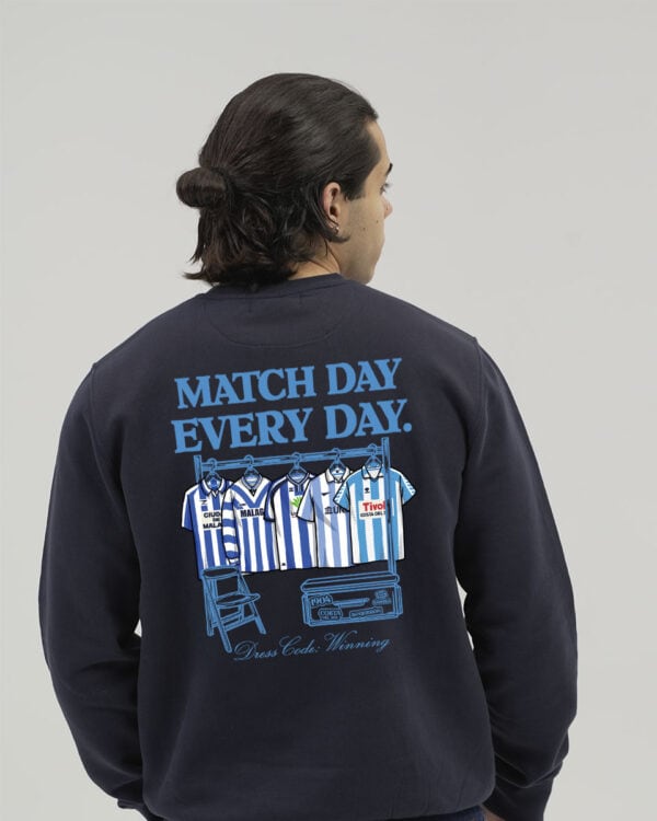 Sudadera sin capucha de color azul navy con 5 camisetas míticas del club boquerón. Toda una insignia para los seguidores del equipo.
